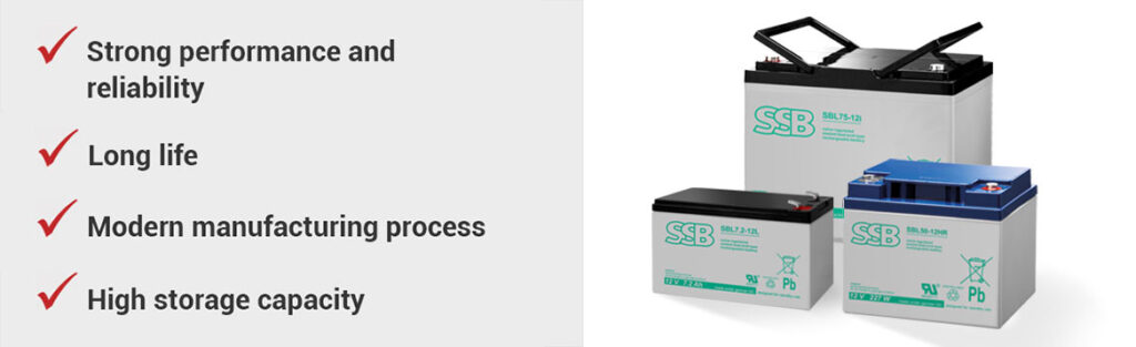 SSB batteries feature the latest, most innovative technology for valve-regulated, sealed rechargeable lead batteries. For more than 15 years, these have been manufactured using the latest production methods. SSB Battery offers a range of VdS approved batteries. These maintenance-free AGM batteries feature the latest glass fibre mat technology. Thanks to the continuous optimization of our products based on the latest research, SSB Battery guarantees the highest degree of quality, reliability and innovation.